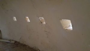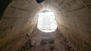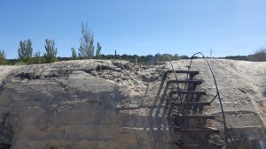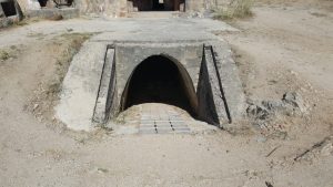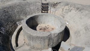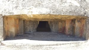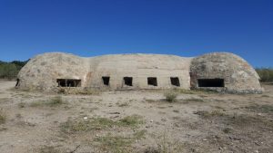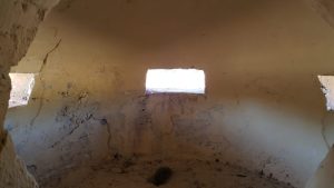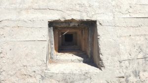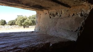 El búnker tiene una gran solidez como se puede apreciar a simple vista. De hecho fue construido para resistir proyectiles de 155mm y bombas de aviación de hasta 100 kg. Un impacto puede apreciarse en la parte superior de este, sin que consiguiera penetrarlo, aunque a costa de dejar una gran muesca. En la galería fotográfica os dejo una imagen de esto. Mayor solidez le dan las troneras con derrame escalonado, tanto las dispuestas para ametralladoras en los cuatro fortines, como las de fusilería.